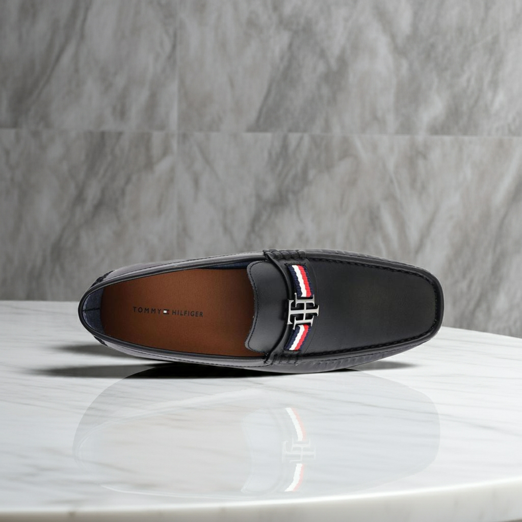 This Drivers features the classic Tommy Hilfiger "global stripe bit" with a sleek metallic "TH" logo at the center, adding a hint of brand elegance.